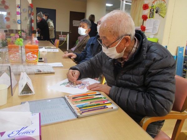本日午後のレクリエーションは「一月の塗り絵と飾り作り」です。