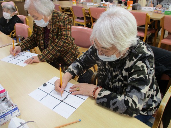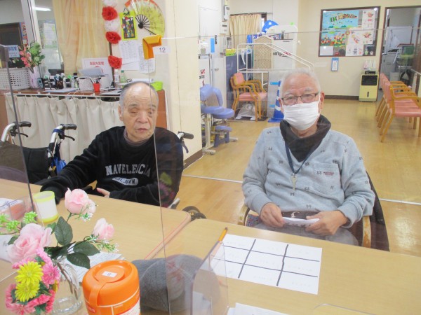 ゲームがスタートすると、「あと一つでリーチだよ!」「おしい!」と真剣な眼差しでカードを見つめながら、どんどん盛り上がっていきました。景品があるわけではないのですが、リーチ!ビンゴ!の声が響き、皆様大興奮!笑顔いっぱいの楽しい時間となりました。12月の雰囲気を味わいながら、脳トレにもなるビンゴゲーム。クリスマス日のクリスマス会では景品付きビンゴ大会もありますのでどうぞお楽しみに♪