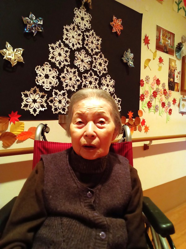 ケアスタッフお手製の折り紙で作った雪の結晶のクリスマスツリーを背景に記念撮影♪(*´∀`)