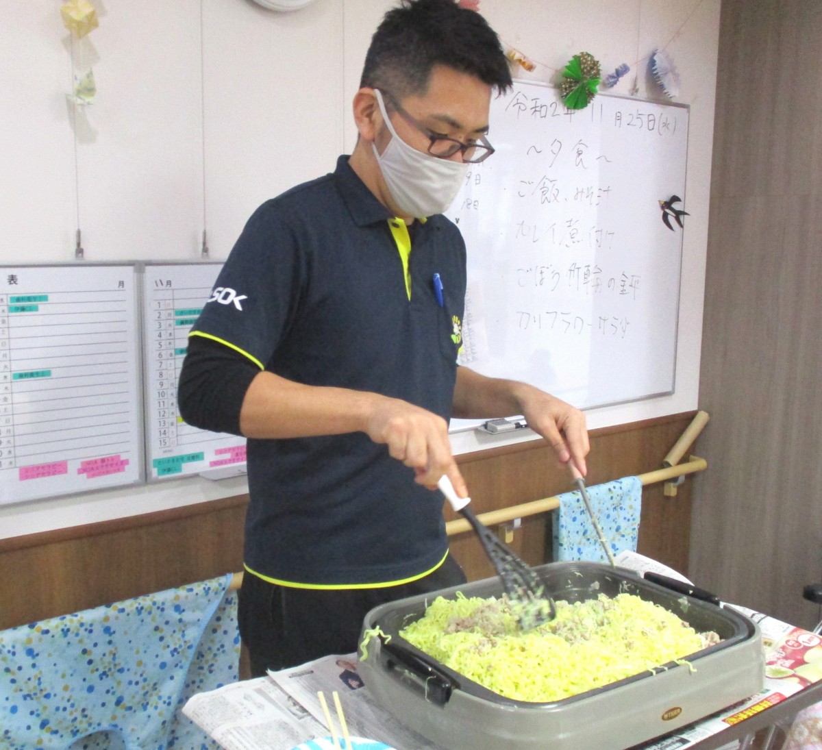 調理する職員を囲んで、焼けるソースの匂いを楽しんで頂きました。