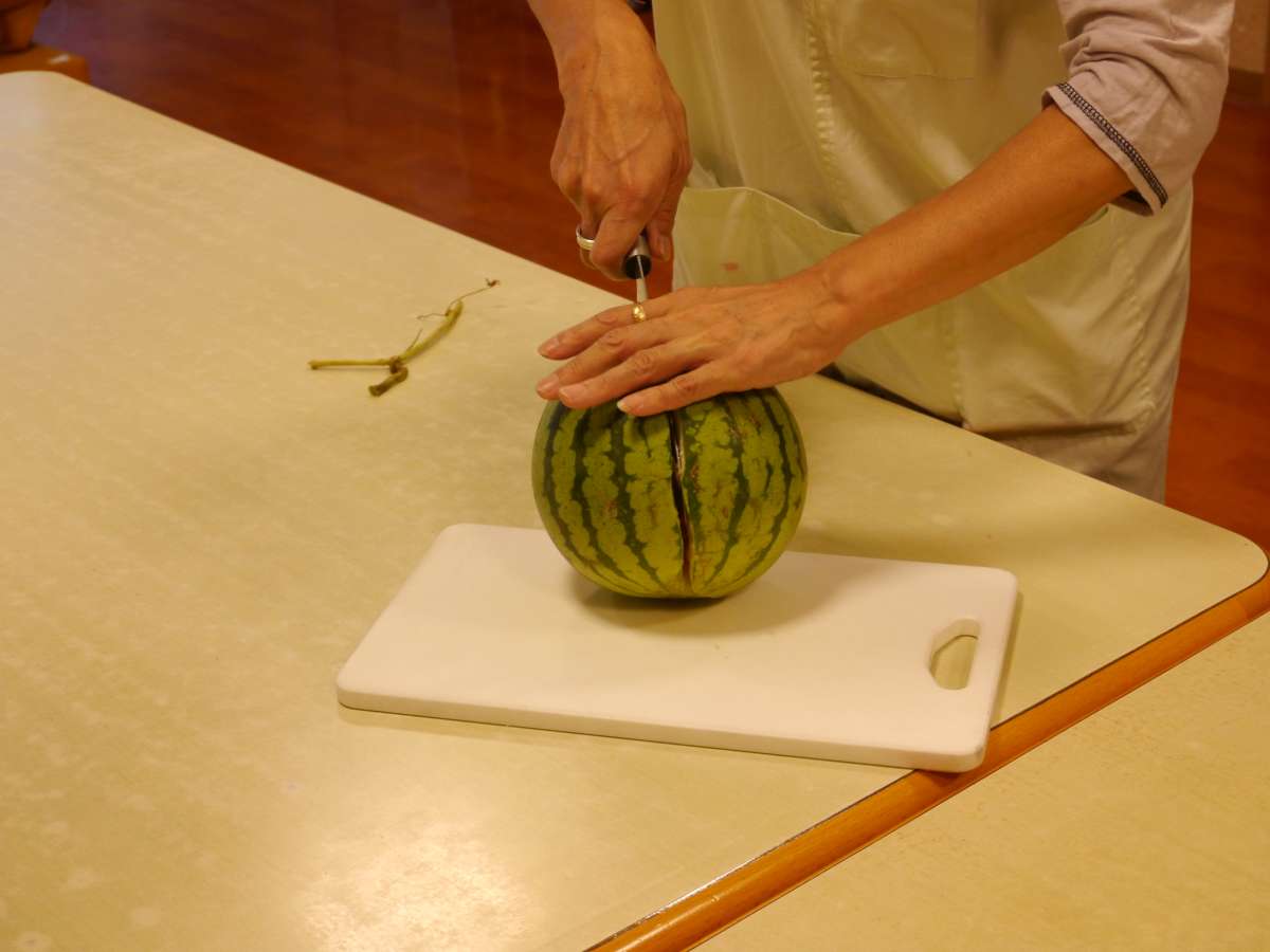さあ、入刀です・・・はたして、真っ赤に熟れてるか、それとも皮ばかりか?!