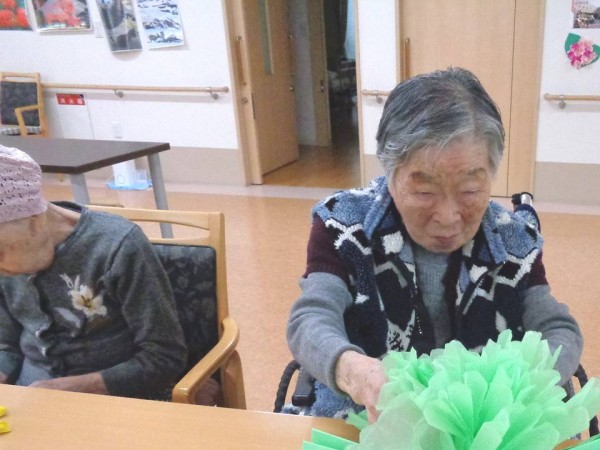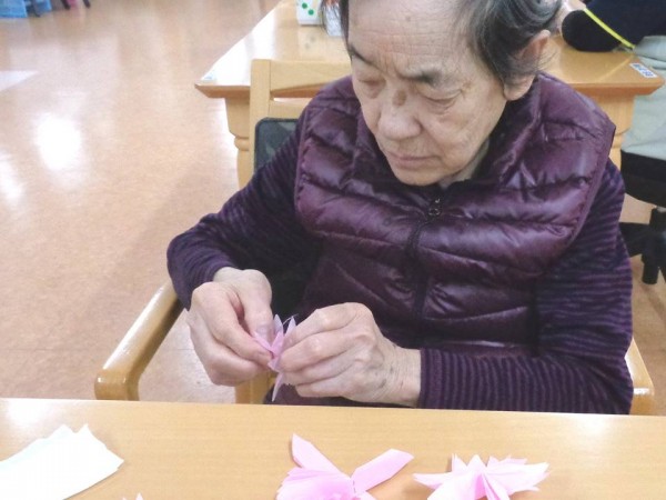 桜作成の準備中です。これが入居者様の手作業で綺麗な桜になっていきます。手作業をしながらの会話も楽しみのひとつです。お喋りはたのしいですよね。そんないくつかのシーンをご紹介します。