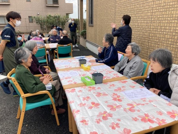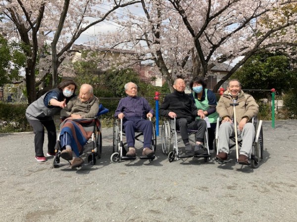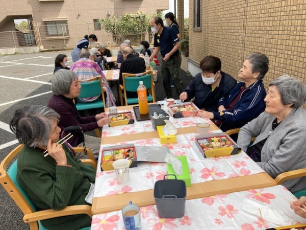 ホームの駐車場にてお花見弁当を召し上がっていただき、「隅田川」合唱して楽しい時間を過ごしました!