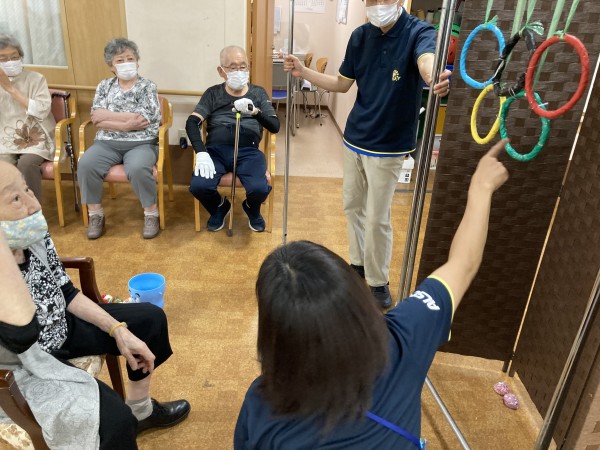 お手玉を投げて、五輪に見立てた輪に入れば成功です!