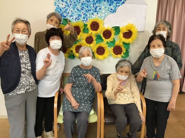 前回の壁画は紫陽花でしたが、夏!ということで、利用者様にひまわりを作っていただきました。