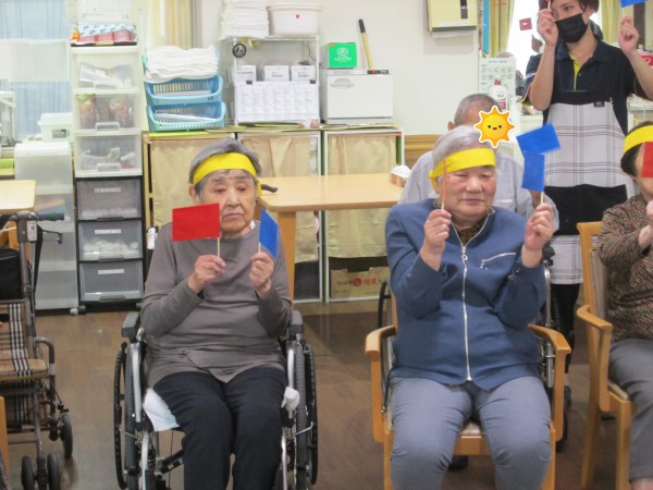 亜佐美先生の「赤あげて~青上げて~」の掛け声と一緒に皆さん真剣な顔で旗揚げ!(^^)!