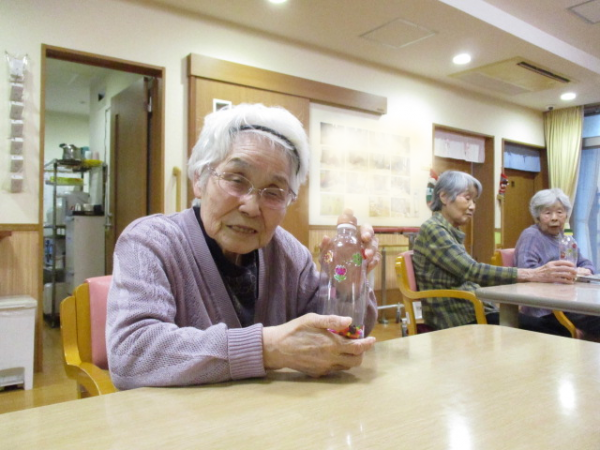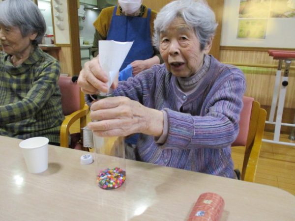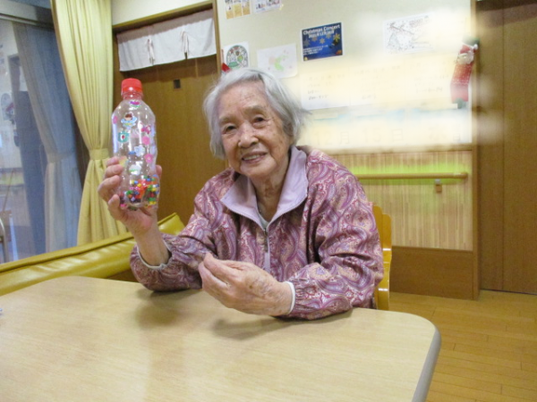 ご利用者様手作りの楽器「ペットボトルマスカラ」いやいや、、、「マラカス」を使い参加(^^)/