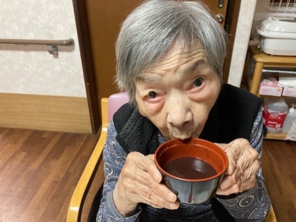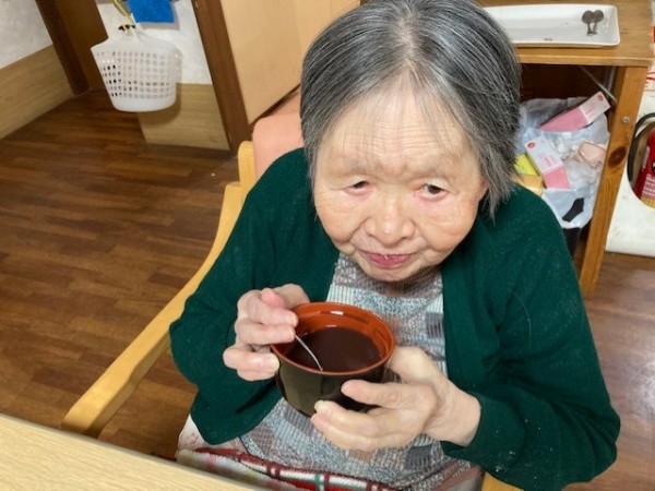 前回のブログの続きでかるた大会が終わりましたので、おやつにおしるこを召し上がっていただきました。あまりにも熱中したかるた大会だったので甘いおしるこで一息しました。