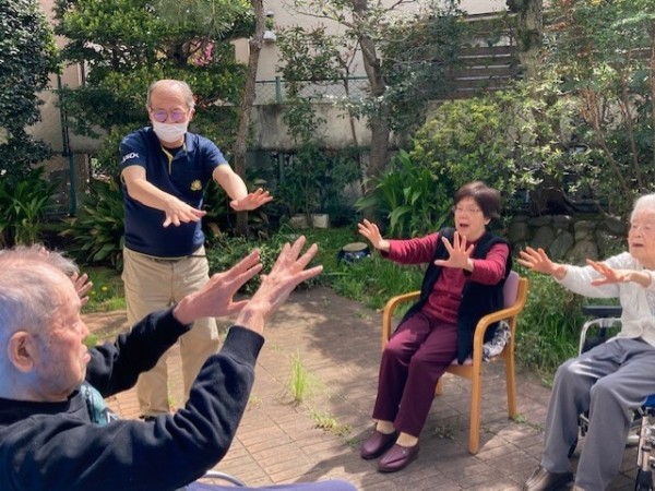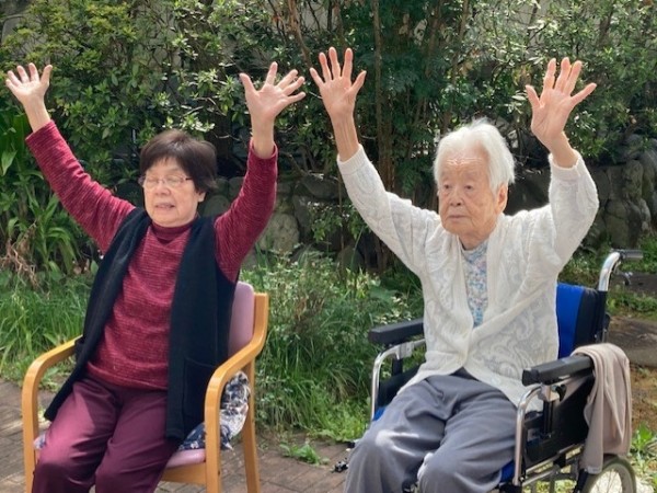 今回はホーム長とご入居者様が一緒にベランダにて体を動かしていましたので写真を撮ってみました。その日は朝からとても晴天であり、気持ちが良かったのでお外にて体を動かすことにしました。
