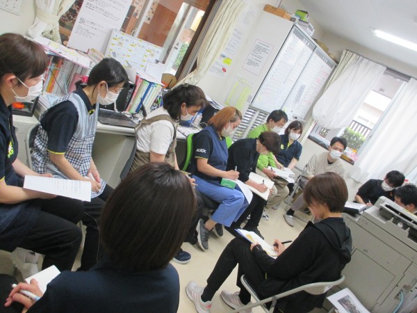 みんなで色々なことを共有しご利用者様の介護や看護に繋げていけるようにします。。