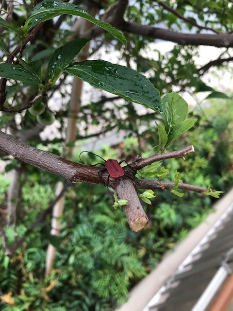 ネットで調べたら、「ベニカミキリ」という名前の虫でした。