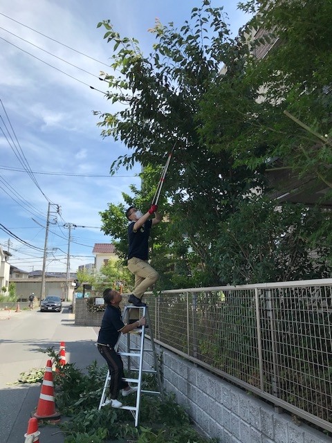 施設の敷地内に植えてある木の枝が伸び目の前の道路に出てきてしまっていたため、本日営業さんと営繕職員とホーム長で枝切りをしました。