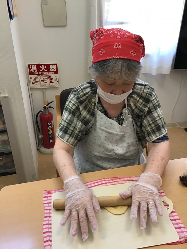 パン生地を丸く麺棒でのばしてあんこを包みます。