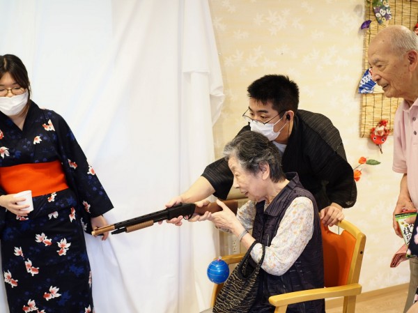 ホーム長やケアリーダーの的に命中させるご利用者様や
