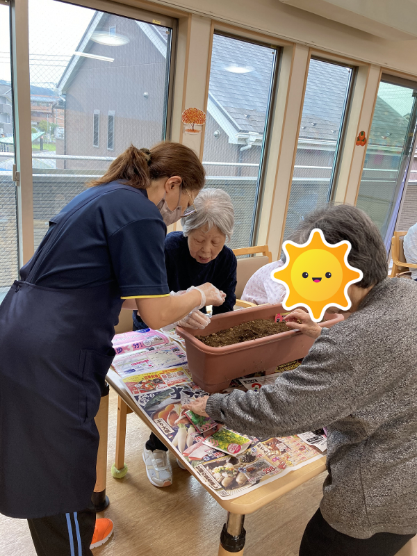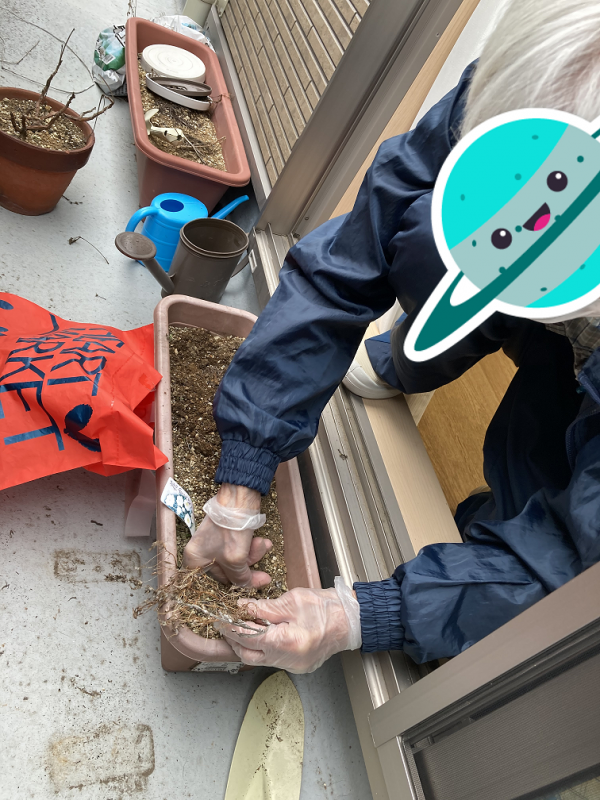 ベランダに植木鉢がありましたので、お花を咲かせようと利用者さまと一緒に種をまきました~(^^♪
