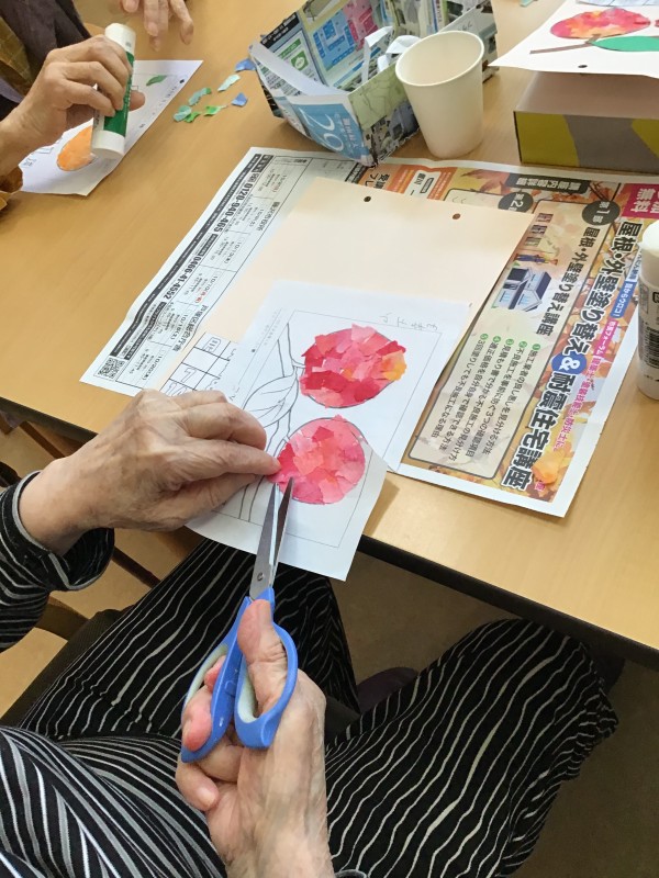 貼って下さったそれぞれの果物をハサミで切っていただき、カレンダー用紙に貼っていきます。