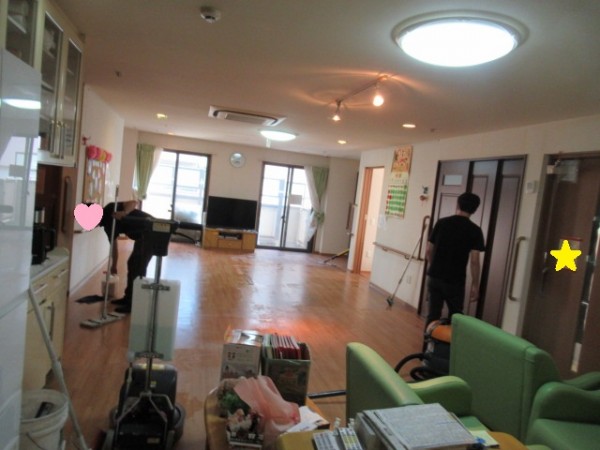 午後になり、共有スペースのフロアを半分ずつにわけて清掃開始!