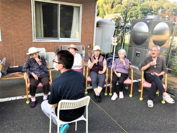 皆様昼食後のお昼寝中に、フロアの椅子全部が外に並べられていました。