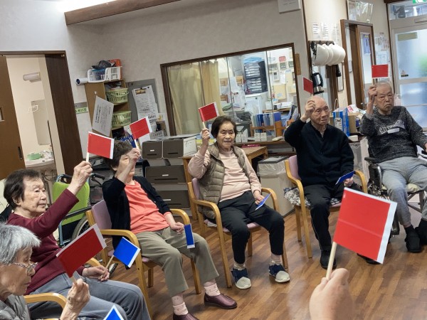 次は旗揚げゲームをしました。リモート越しで参加したため、やや聞こえづらい様子がありましたが、上手に旗を揚げていました。