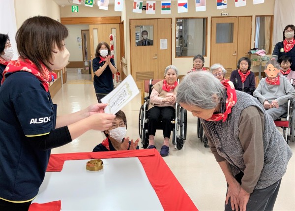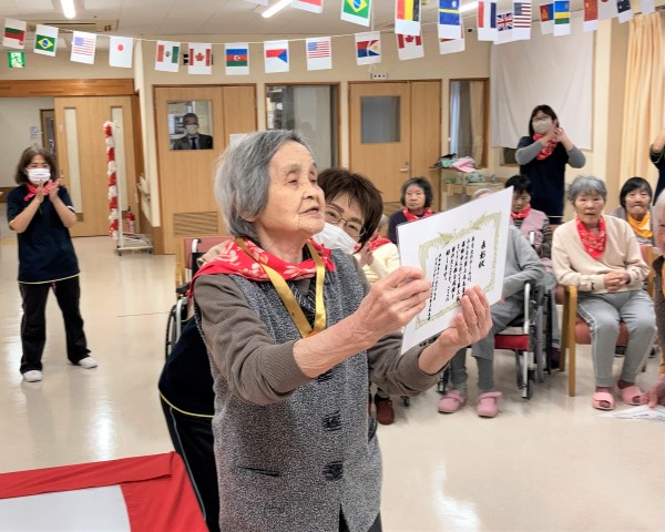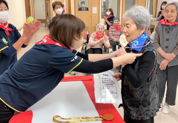 ホーム長から賞状とメダルの授与です☆フロアの代表者は前に来てください♪
