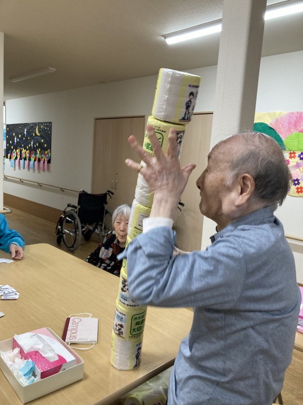 ご自分の背よりも高く積み上げ、ハラハラドキドキのちょっとしたレクリエーションです♪♪