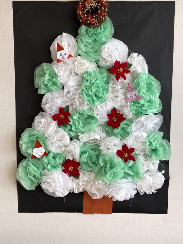 お花紙(白い紙は実はお花紙だけではないのですが…ティッシュとお習字用の半紙が混ざっています)、何に変身したかと言いますとクリスマスツリーになりました。