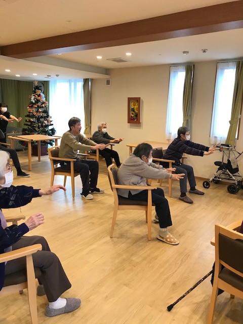 クリスマスが近いということで、クリスマスの曲に合わせてストレッチや簡単なリズム体操をしました。