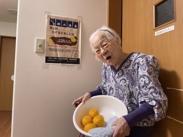 今年も冬至にはゆず湯で温まっていただきました。ゆずの香りっていいですよね。皆さんクンクン。『あら、ゆず??いい香りね、もう冬至ね~』なんてお話されていました。