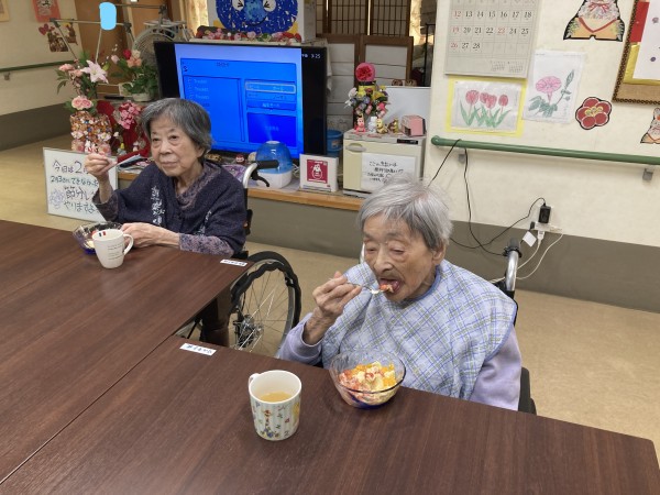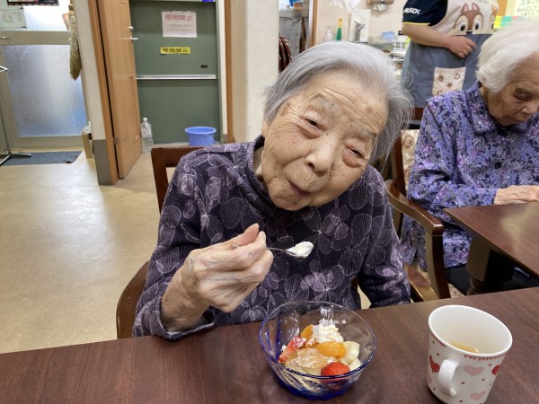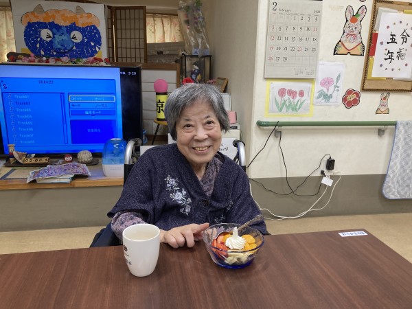 豆まきの後、スタッフ手作りのプリンアラモードと青森産りんご100%のりんごジュースをお召し上がりになりました