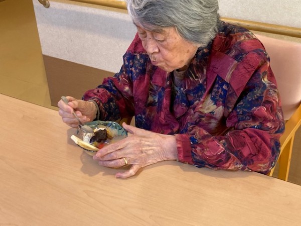 お誕生日のおやつは、職員手作りのフルーツあんみつを美味しそうに召し上がっていました。