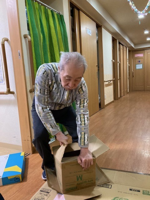 今回はほんの一部ですが、スタッフと協力して段ボールの分解や、入居者様同士協力したりして、
