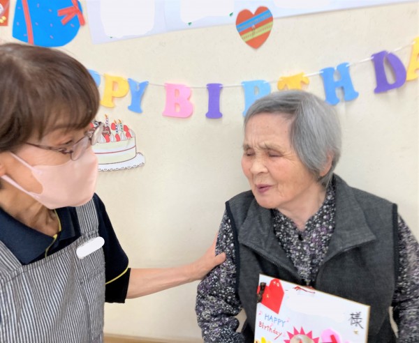 お昼ご飯のお寿司を食べ終わった後、お誕生日会当日にシニアセラピーさんが♪
