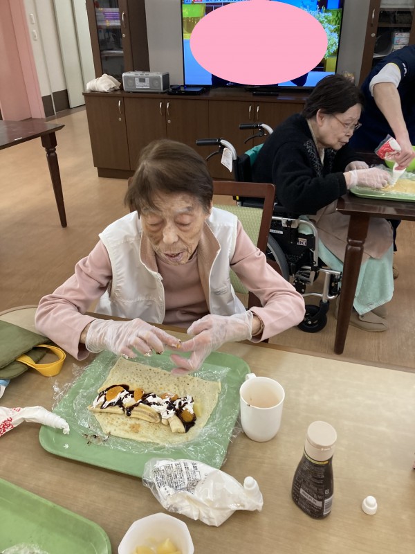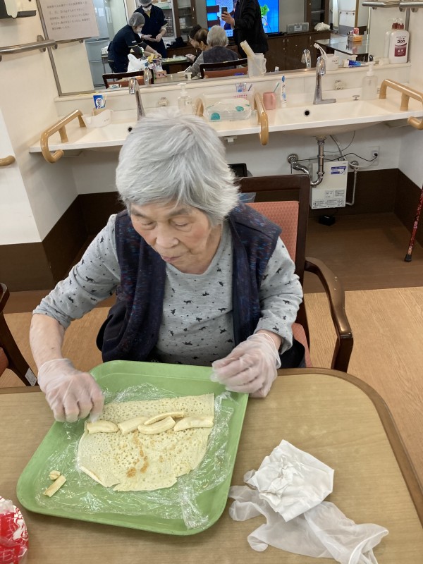 今回はクレープ作りに挑戦しました。ホットケーキの生地を薄くのばし焼いていきます。中身の具材はバナナ・あんこ・ミカン・パイナップル等です。さらに、生クリームやあんこも入りました。