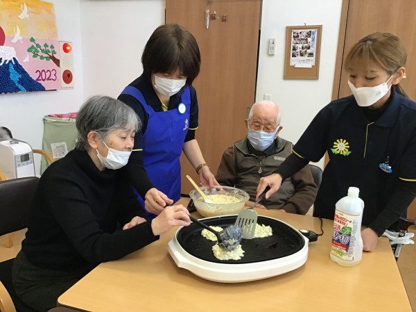 お玉で生地を流していただいていますが、お玉1杯分がちょうどいい大きさです☆☆