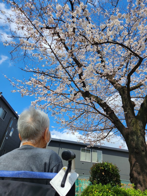風になびく桜の花びらがちょうど入居者様の頭の上に落ちてきて、髪飾りのようにつけて写真を撮ってみました☆