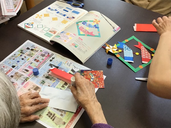 折り紙で鯉のぼりの鯉を作っていただいています。