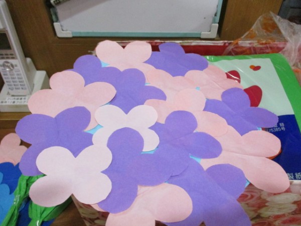 青・白・ピンク・紫etc.の折り紙を台紙に貼り大作です。