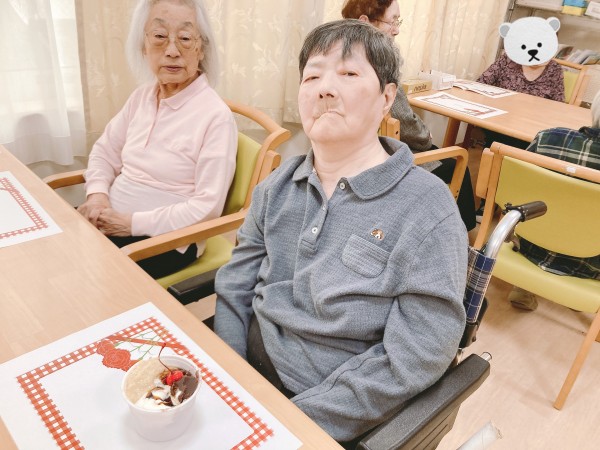 さくらんぼにバナナにアイスが乗ったあんみつ、職員手作りのお手紙とカーネーションをお渡しいたしました。