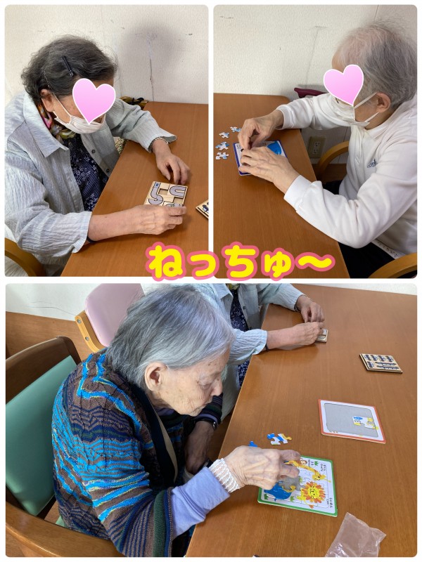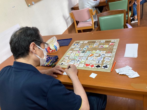 ご利用者様が楽しんでくださるように、絵あわせパズルの補修中。