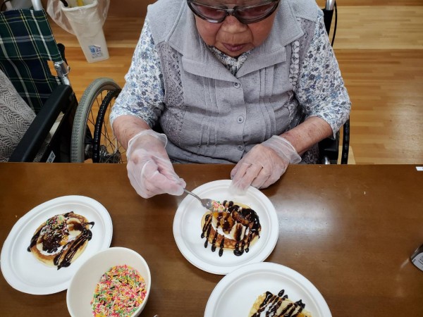 おやつレクを行いまして、皆さんと一緒にホットケーキを作りました(^^♪