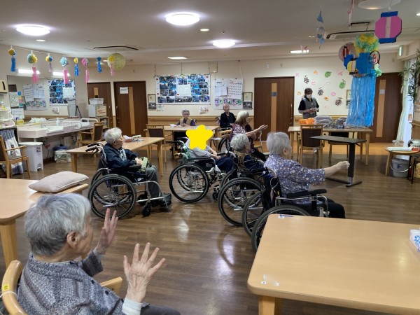 深呼吸をして、手を広げて皆様無理なくゆっくりと取り組まれました。