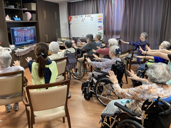 ホールに集まったご利用者様も、画面に映る法被姿のトレーナーに興味津々。