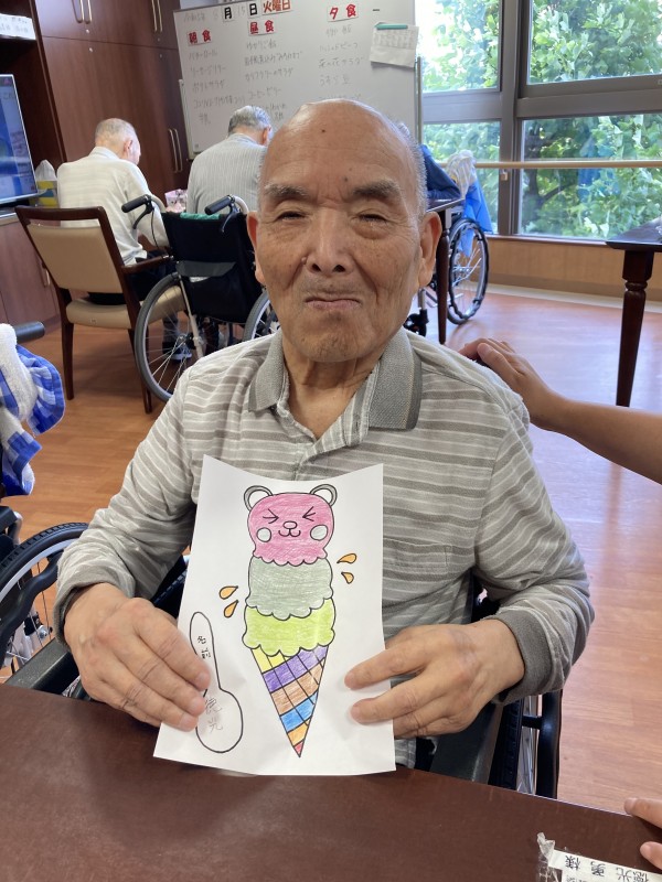 男性ご利用者様も、職員と相談しながら冷たそ~な色合いになるよう色鉛筆をチョイス。