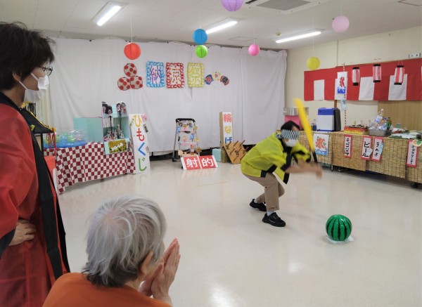 大玉スイカをかけてスタッフによるフロア対抗スイカ割りが行われておりました。笑