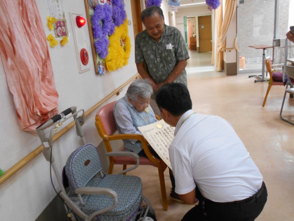 市役所から市長さんが来られ、ご家族様と一緒に百寿のお祝いをして下さいました。