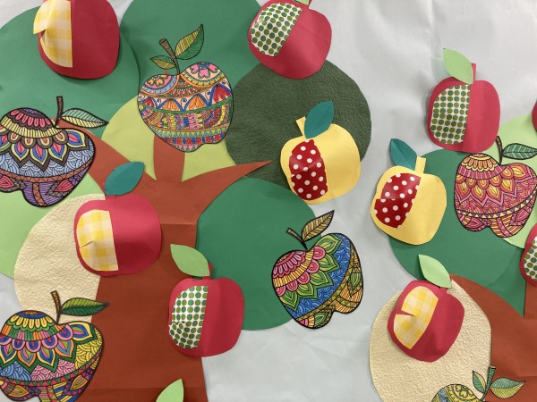 1つ目は、画用紙をリンゴの形に切ってチェック柄やドットの用紙を貼り合わせてできています。