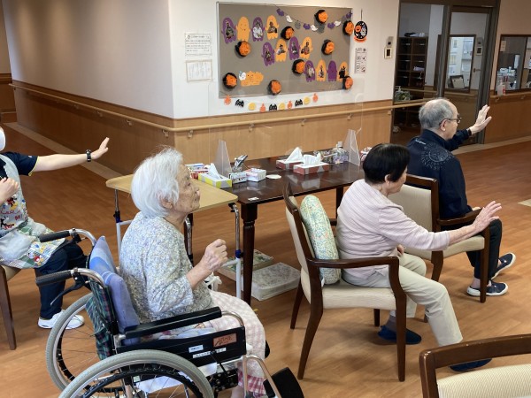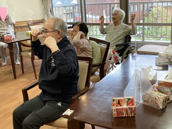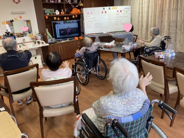 軽快な音楽のリズムに乗って、テレビに映るトレーナーの合図に合わせ、元気に体を動かしました。