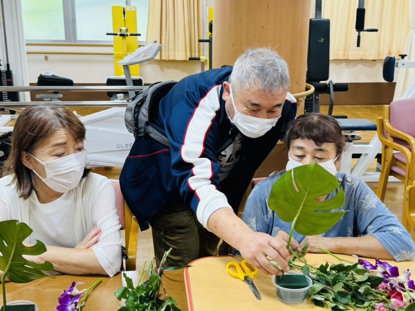 まずは土台となる葉っぱ(名前が難しくて覚えられなかった……)を切って活けて行きます。
