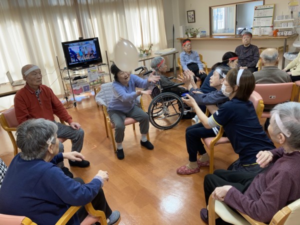 まずは風船バレーの様子です。紅組・白組に別れ落とさないように、皆さんがんばっています。