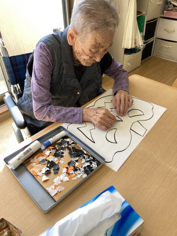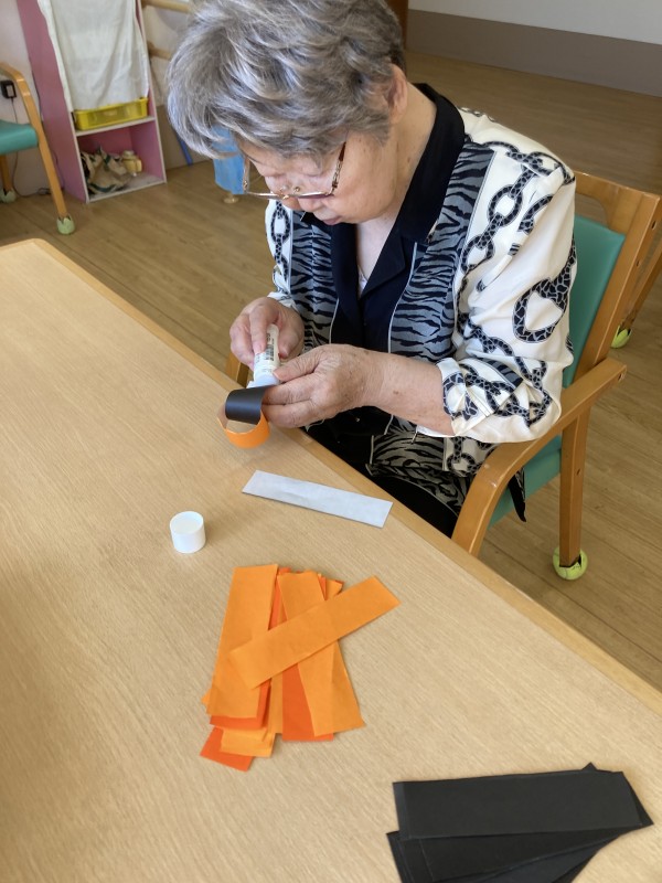 皆様にはかぼちゃのお化けのイラストにちぎり絵をしていただいたりオレンジ色と黒色の折り紙を使っての輪っか作りをしました。